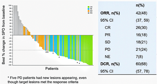本研究达到了主要终点,FAS集的总缓解率(ORR)为48%,26例患者(30%)达到完全缓解(CR),16例患者(18%)部分缓解(PR),还有18例患者(20%)达到疾病稳定(SD),疾病控制率(DCR)为68%。