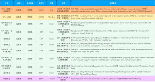 在乳腺癌领域,DB真人创新产品相关研究共入选1项口头报告、1项简短口头报告、8项壁报和1项电子壁报,共11项研究。吡咯替尼、达尔西利、阿得贝利单抗、瑞康曲妥珠单抗等新老创新药物,均有多篇研究入选,展现出DB真人医药在乳腺癌领域多年深耕的丰硕成果。